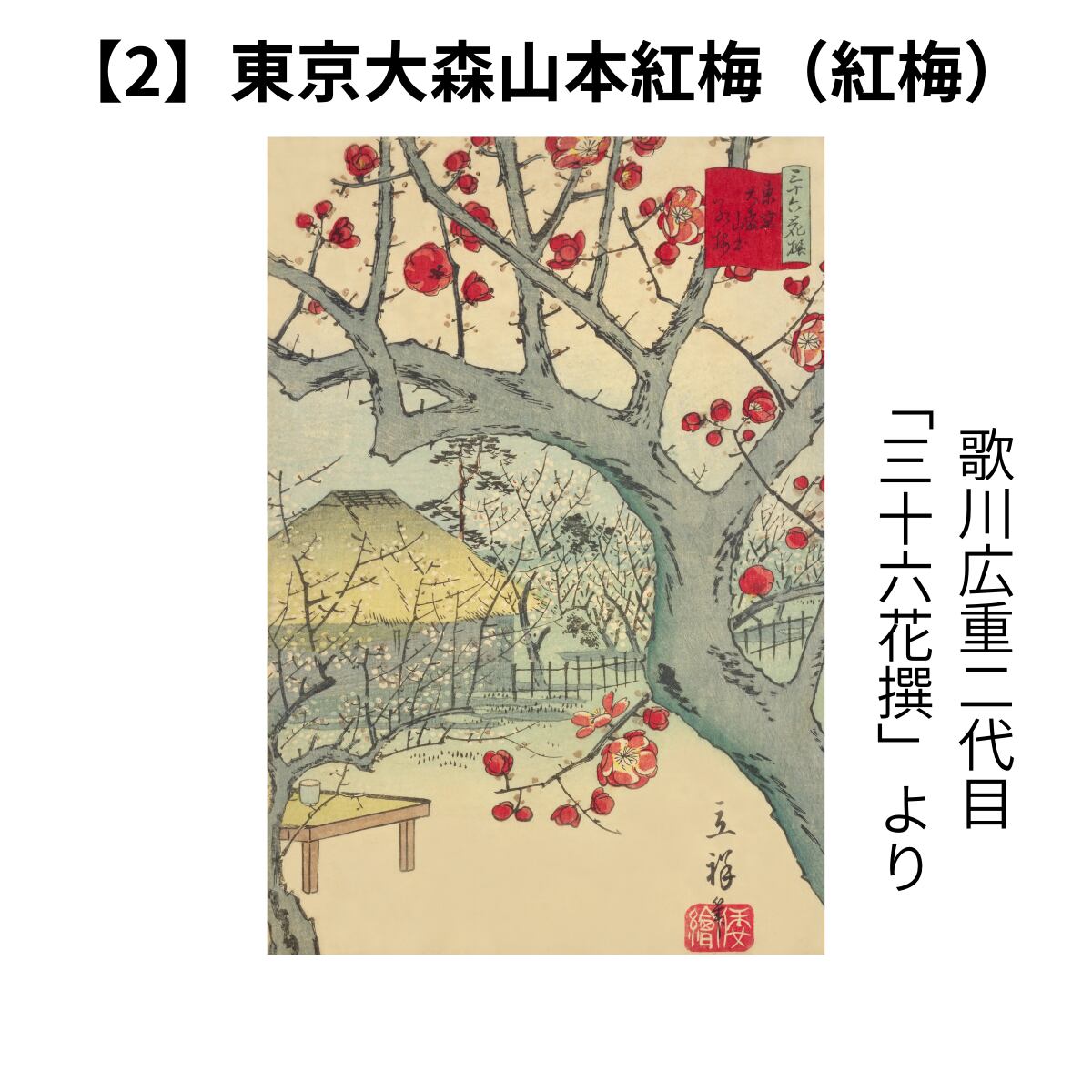 江戸から明治に移り変わる激動の幕末1866年に、歌川広重二代目(雅号:喜斎立祥)によって描かれた浮世絵で、東京(江戸)の名所と共にクローズアップされた季節の美しい花々を描いた花鳥画「三十六花撰」の一つ「東京大森山本紅梅」です。